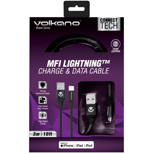 Extend your reach with this 3m Volkano Weave Series Fabric Braided MFI Lightning Cable that boasts a nylon braided cable while supporting Fast Charge and high speed data transfer.Certififed Made for Apple.Supports fast charge.Supports high speed data transfer.Reinforced braided cable.3m Extra length cable.